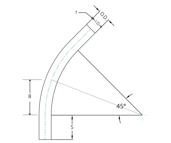 โค้งท่อ 45 ° LR (รัศมียาว) มีขนาดเส้นผ่านศูนย์กลางตรงกลางถึงหน้าขนาดเส้นผ่าศูนย์กลาง 1.5 x เป็นข้อศอกที่พบมากที่สุดและใช้เมื่อมีพื้นที่ว่างและการไหลมีความสำคัญมากขึ้น ในระหว่างกระบวนการผลิตของท่อที่มีส่วนโค้งเย็นเครื่องดัดท่อ CNC สามารถใช้เพื่อโค้งงอท่อตรงลงในท่อโค้งในครั้งเดียว